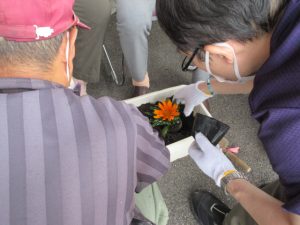 グループホームのご利用者の方に選んで頂いた花苗を丁寧に植え替えました。