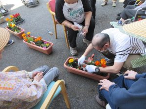 グループホームのご利用者の方に選んで頂いた花苗を丁寧に植え替えました。