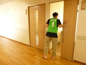 説明後は、避難訓練です。夜間想定のため、夜間の勤務者数を想定しての避難開始です。