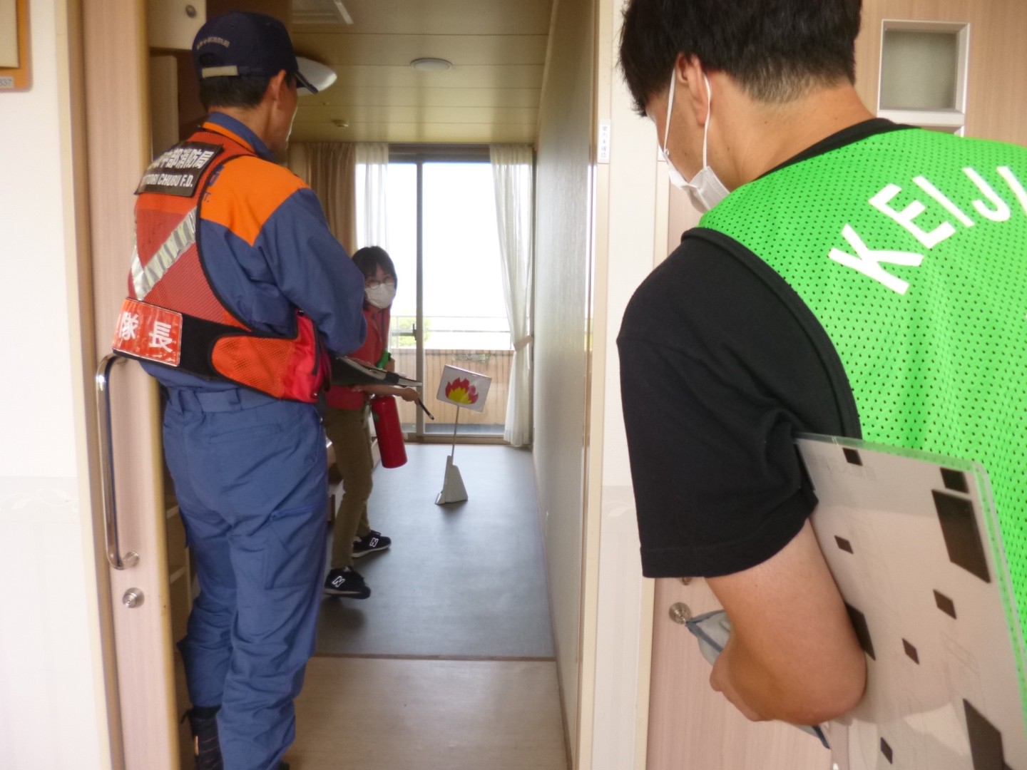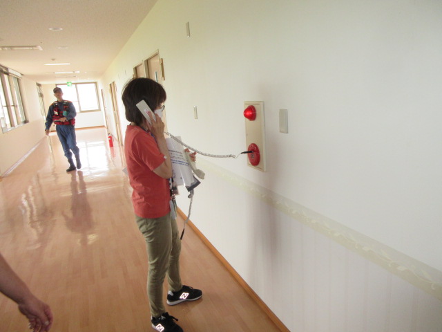 説明後は、避難訓練です。夜間想定のため、夜間の勤務者数を想定しての避難開始です。